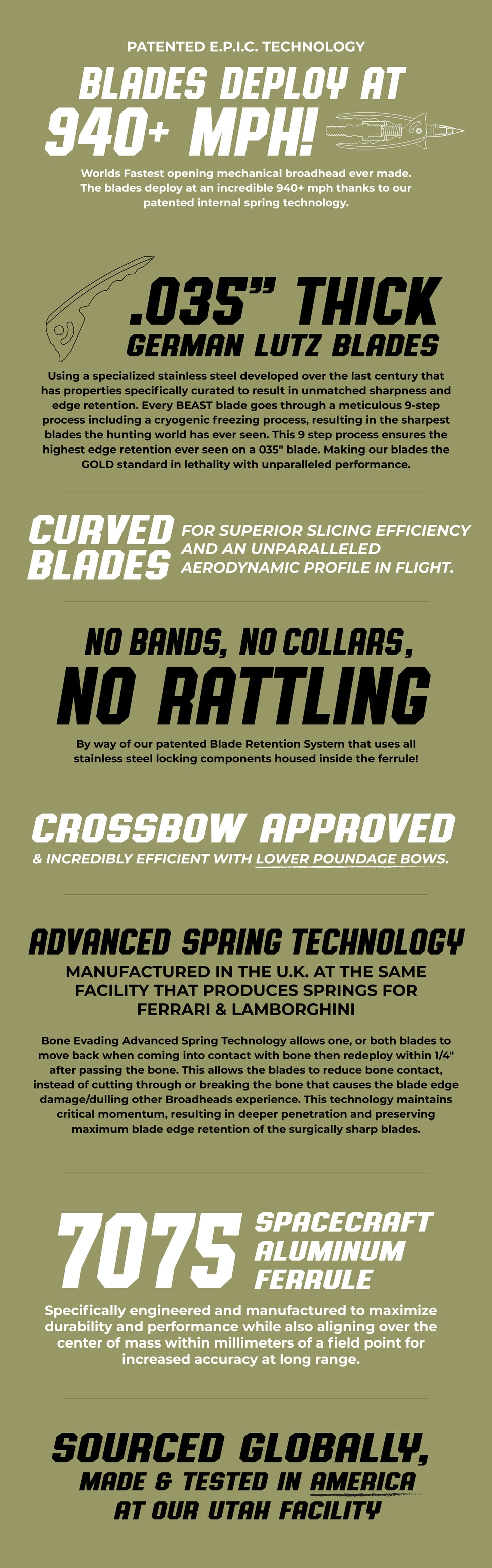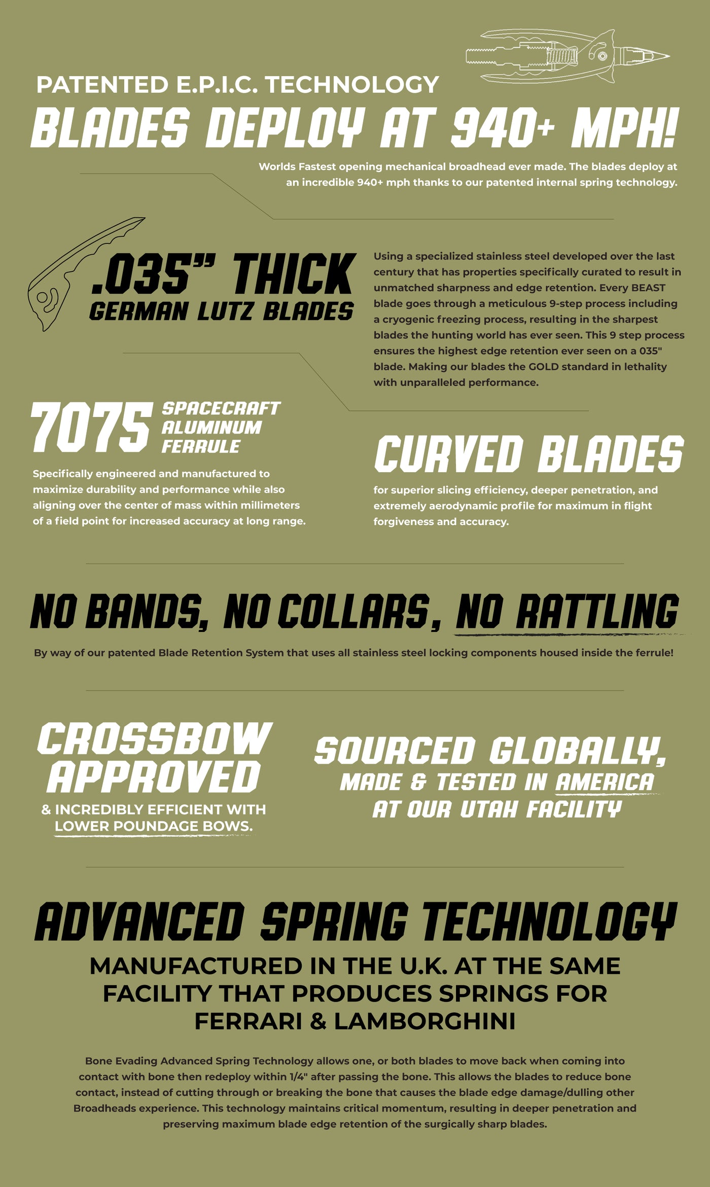 •    Bone Evading Advanced Spring Technology (BEAST): Features blades that retract and redeploy when encountering bone, preserving sharpness and kinetic energy for unmatched penetration.